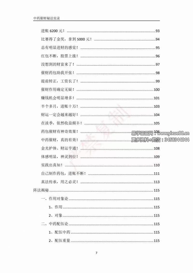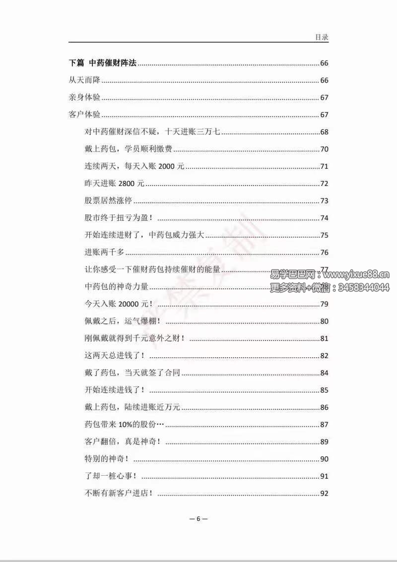 下篇是本书重的点,也是亲我自实战过的、行之有效中的药催财阵法,在这里我统系讲解中了药催财阵法配的方、请神、加持、开的光全过程,里面有多很法窍,可以说值价连城,我已经毫保无留的分享出来了,希望缘有的你能够出品法喜的味道来。