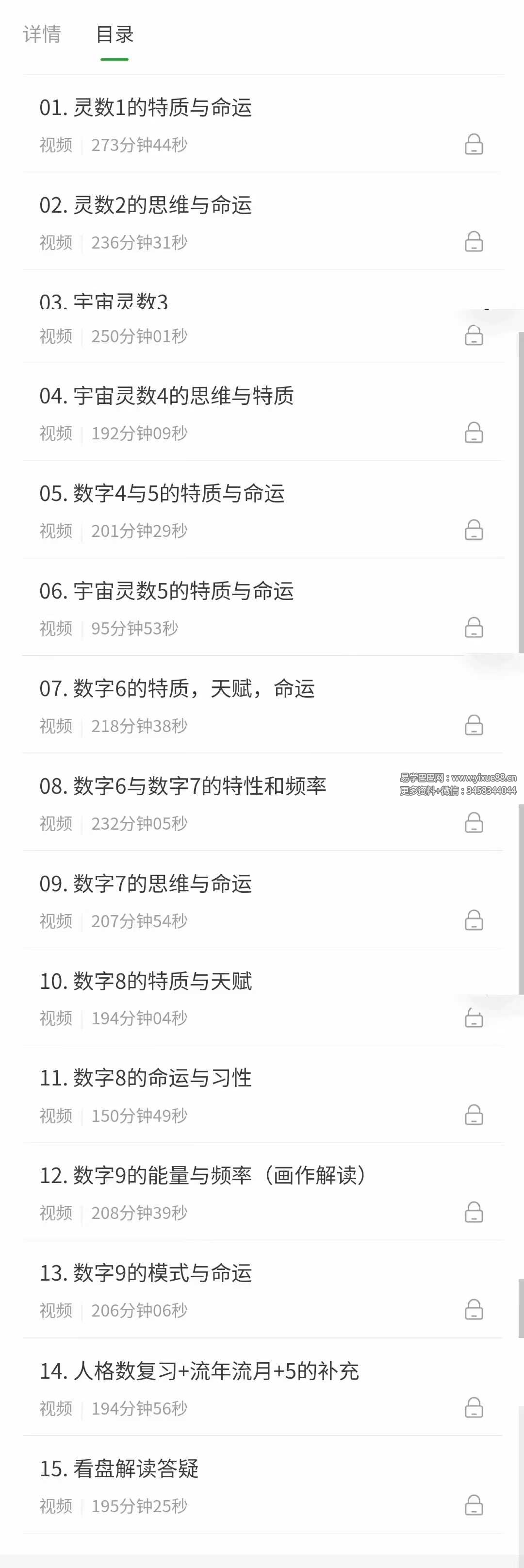 正文概述 课程编号:Y2508003 【宇宙灵数】秦月宇宙灵数课程 服务说明: (1)、资源来源于网络公开发表文件,所有资料仅供学习交流; (2)、学分仅用来维持网站运营,性质为用户友情赞助,并非购买文件费用(1元=1学分); (3)、如遇百度网盘分享链接失效,可以联系客服,管理员都会及时处理的或将资料发送至您提交的邮箱; (4)、在您未收到文件之前,可以联系客服QQ:529202210 进行退款; (5)、不用担心不给资料,如果没有及时回复也不用担心,看到了都会发给您的!放心!易学资源网 » 秦月宇宙灵数15集 常见问题FAQ 免费下载或者VIP会员专享资源能否直接商用? 本站所有资源版权均属于原作者所有,这里所提供资源均只能用于参考学习用,请勿直接商用。若由于商用引起版权纠纷,一切责任均由使用者承担。 付款之后,如何获得资源? 易学巴巴网的资源,均为百度网盘下载,付款之后,点击立即下载,即可跳转百度网盘下载链接,输入密码,就可以提取资料了。 下载链接失效了怎么办? 如遇百度网盘分享链接失效,千万不要着急,联系客服QQ:529202210,我们会第一时间给您发资料,不用担心不给资料,如果没有及时回复也不用担心,看到了都会发给您的!放心!